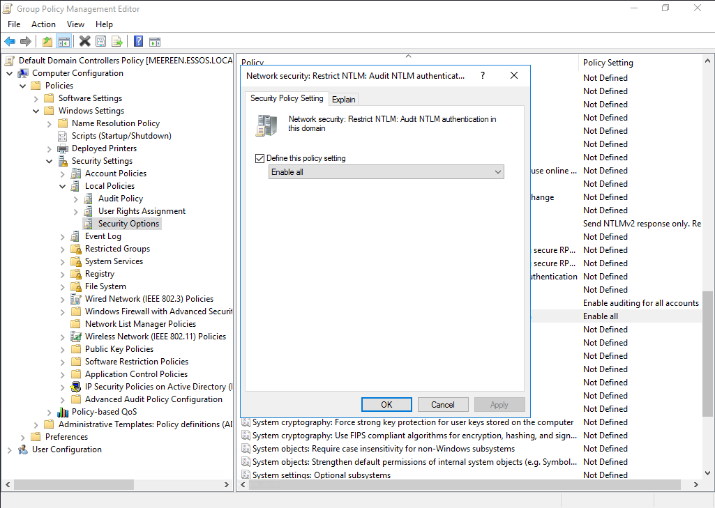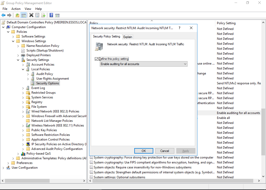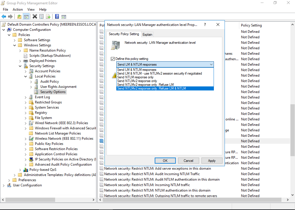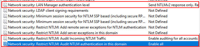 LM & NTLMv1 har ingenting på moderne nett å gjøre. Dersom man ikke setter denne policyen vil man kunne nedgradere fra NTLMv2 til versjon 1 eller til LM, som har svakere mekanismer for autentisering, og øker risiko for en rekke angrep. Ideelt ønsker man å gå over til ren kerberos, men det er ofte en svært utfordrende oppgave.